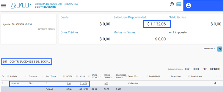 1.- Ingresar con clave fiscal del contribuyente al sistema de cuentas tributarias y una vez allí chequear que figure el saldo de libre disponibilidad correspondiente al impuesto 351 tal como se ve en la imagen siguiente: