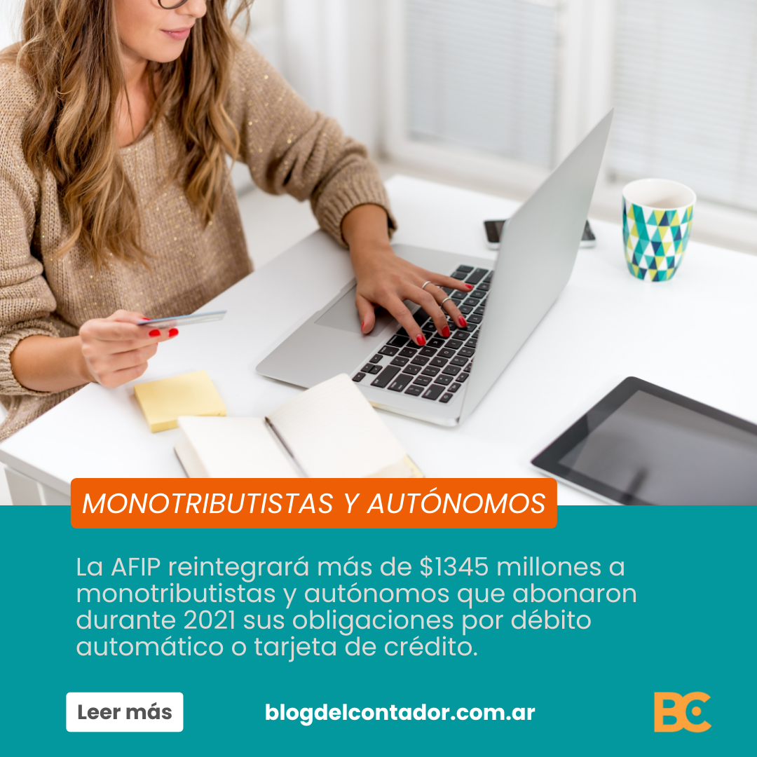 La Administración Federal de Ingresos Públicos (AFIP) reintegrará más de $1345 millones a monotributistas y autónomos que abonaron durante 2021 sus obligaciones por débito automático o tarjeta de crédito. El beneficio al cumplimiento alcanza a más de 649 mil pequeños contribuyentes de todo el país: 557 mil monotributistas y 92 mil autónomos.